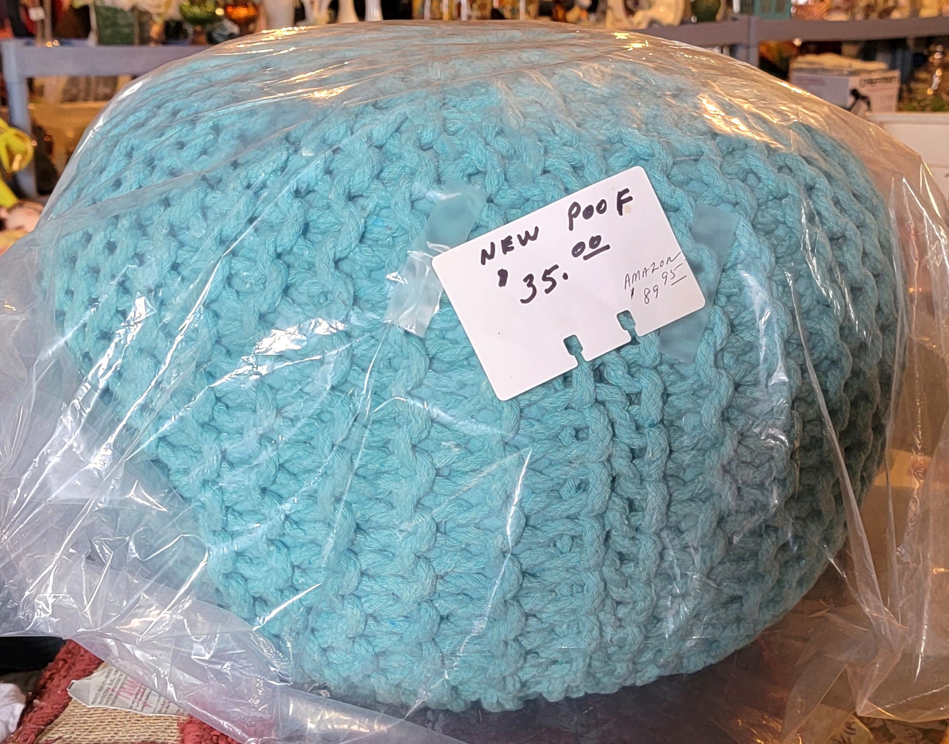If you think you don't, you just haven't tried a "Pouf Ottoman" yet! This blue/green ottoman is a bean bag covered with cotton braiding. It is new in the bag! This is a great deal - add a little pop of color and style to your decor!